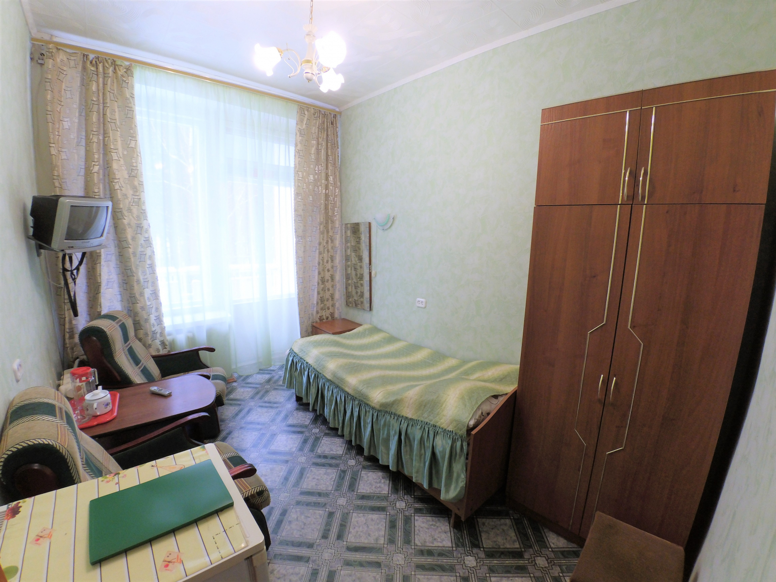 В номере для одноместного размещения: одна полуторная кровать, гипоаллергенные подушки и одеяла, шкаф для одежды, плазменный телевизор, холодильник, набор посуды (графин, стаканы), электрочайник, фен.
