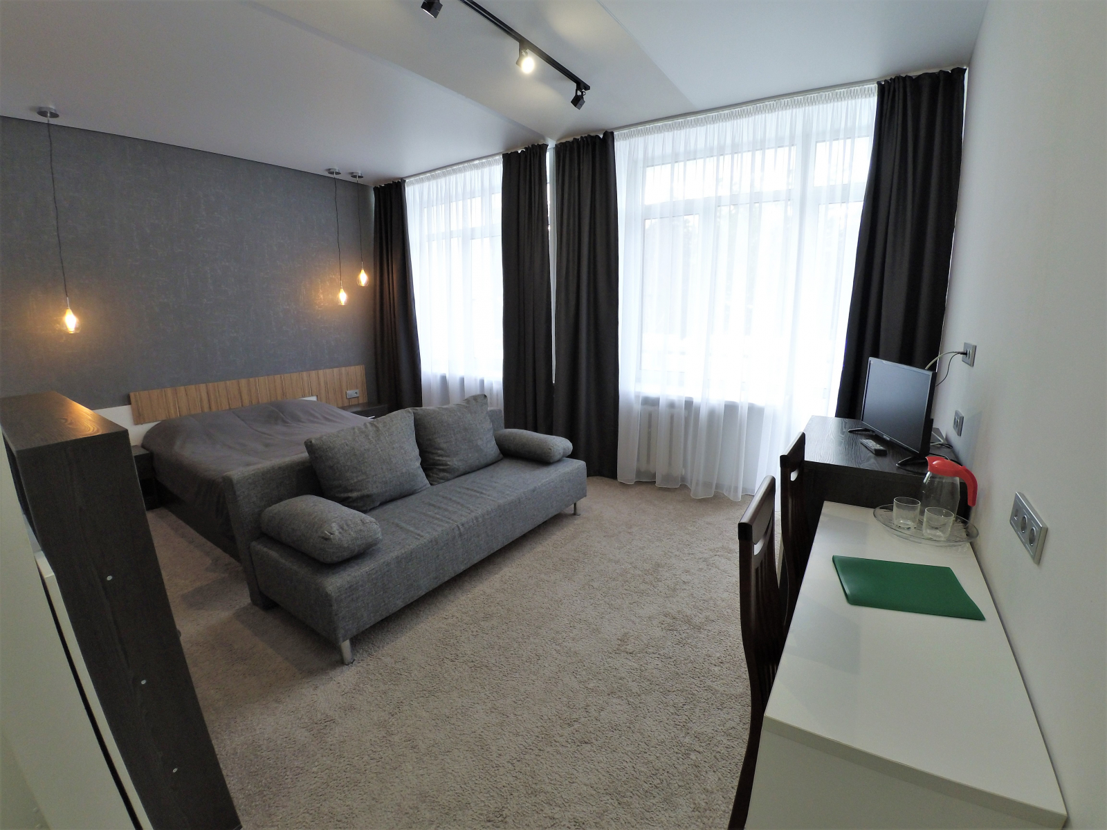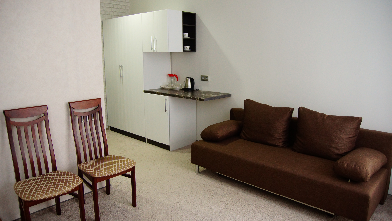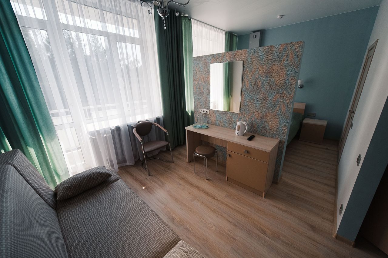 В номере: двуспальная кровать или две раздельные, диван, гипоаллергенные подушки и одеяла, шкаф-купе, плазменный телевизор, холодильник, набор посуды (графин, чашки, стакан, электрочайник).
