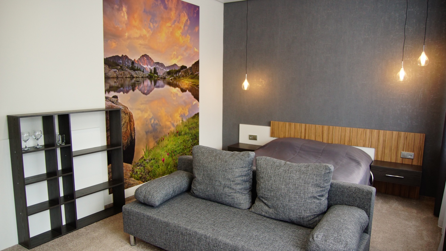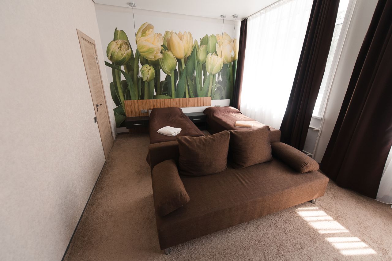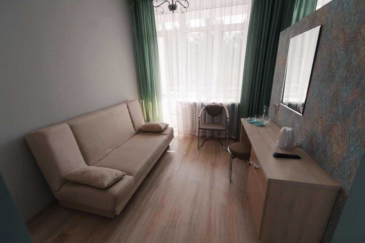 В номере: двуспальная кровать или две раздельные, диван, гипоаллергенные подушки и одеяла, шкаф-купе, плазменный телевизор, холодильник, набор посуды (графин, чашки, стакан, электрочайник).